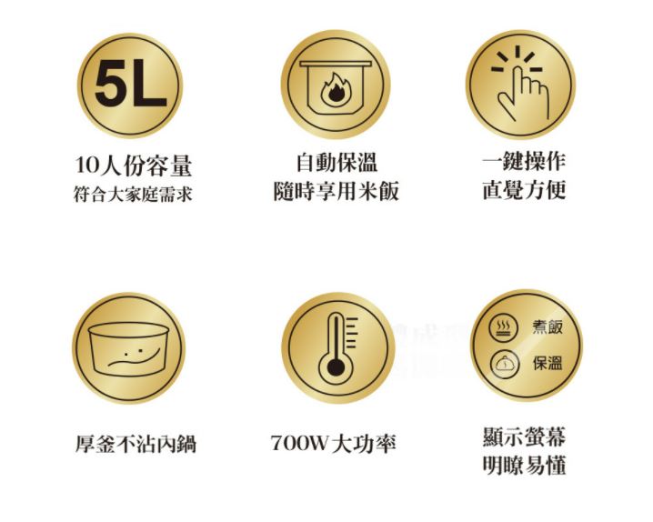 1. 10人份容量5L,滿足一般家庭需求