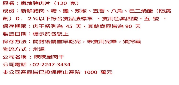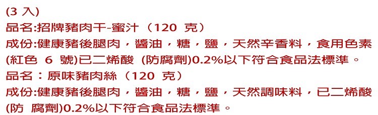 規格:招牌蜜汁豬肉乾120g+原味豬肉絲120g+麻辣豬肉片120g。〔禮盒尺寸:26.5x4.5x19.5cm〕。豬肉(原料)來源產地:台灣。規格:招牌蜜汁豬肉乾120g+原味豬肉絲120g+麻辣豬肉片120g。◆招牌蜜汁豬肉乾成份:健康豬後腿肉、醬油、糖、鹽、天然辛香料、食用色素(紅色6號)、已二烯酸(防腐劑)0.2%以下符合食品法標準★保存期限:未開封45天★保存方法:開封後請盡早吃完,未食用完畢,須冷藏。◆原味豬肉絲成份:健康豬後腿肉、醬油、糖、鹽、天然調味料、已二烯酸(防腐劑)0.2%以下符合食品法標準。★保存期限: 未開封90天★保存方法:置於室內,避免放置潮濕、高溫、日曬場所,開封後請盡速食用完畢。★製造日期:標示於包裝上。◆麻辣豬肉片成份:新鮮豬肉、糖、鹽、辣椒、五香、八角、已二烯酸(防腐劑)0.2%以下符合食品法標準、食用色素四號、五號★保存期限:未開封90天。★保存方式:置於室內,避免放置潮濕、高溫、日曬場所,開封後請盡速食用完畢。★製造日期:標示於包裝上。★原產地:台灣。★公司名稱 : 味味屋肉干。★本店產品通過SGS安全認證及投保美亞產物保險一千萬,請安心食用! |
