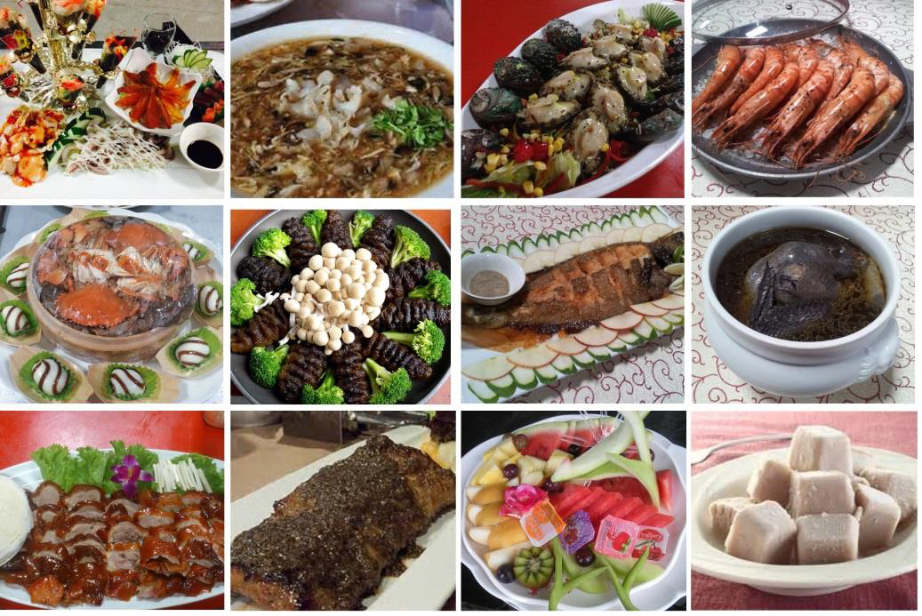 (淨重11300克,可供10人份食用):1.四海大拼盤(日月蛤,章魚,煙燻雞,烏魚子,魚蛋)共1000克、2.古早味海鮮羹/1400克(豬肉(原料)來源產地:台灣)、3.和風大鮑魚/800克、4.蟳米糕拼奶皇包/1400克(豬肉(原料)來源產地:台灣)、5.何首烏燉烏骨雞湯/1500克、6.香烤大鱈魚/700克、7.鹽烤大明蝦/500克、8.黑胡椒豬肋排/1000克(豬肉(原料)來源產地:台灣)、9.港式烤鴨/800克、10.陶燒海中鮮/900克、11.水果拼盤700克、12.芋仔冰/10入/600克 |