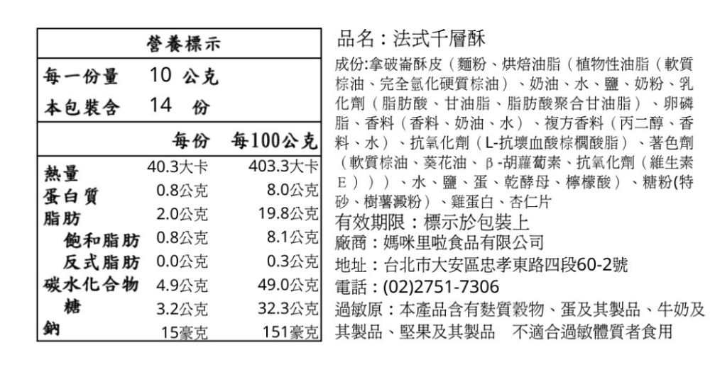 保存期限:依包裝上有效期限為主 (常溫保存45天) 產地:台灣成分:如圖所示營養標:如圖所示過敏源:本產品含有麩質穀物,蛋及其製品,堅果及其製品、牛奶及其製品,不適合其過敏體質者食用