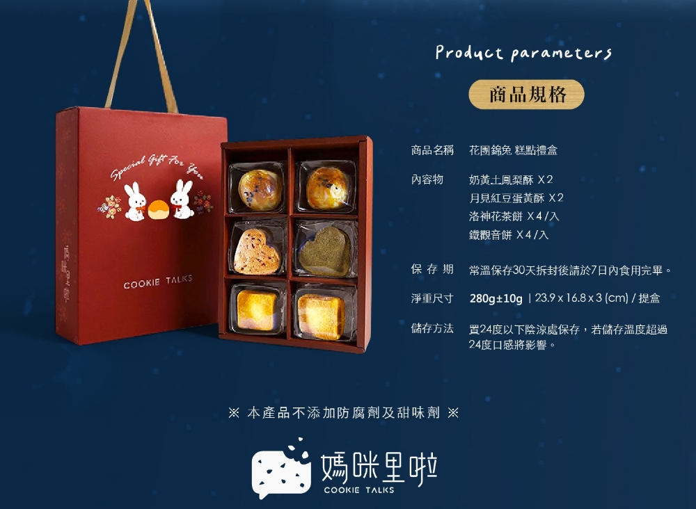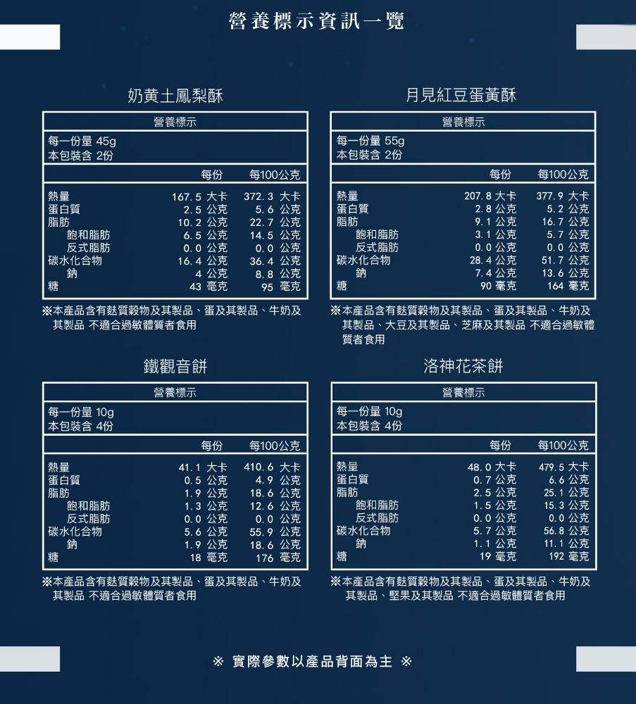 🌕奶黃土鳳梨酥 2 入 成份:低筋麵粉、冬瓜醬(冬瓜、鳳梨、砂糖、麥芽、 紐西蘭無水奶油)、奶油、糖粉(精緻特砂、樹薯澱粉)、土鳳梨餡(土鳳梨、麥芽糖漿(樹薯澱粉、水)、精緻 特砂)、無水奶油、奶粉、蛋黃、全蛋、乳酪粉、葡萄 糖、檸檬酸、鹽 過敏源:本產品含有麩質穀物及其製品、蛋及其製品、牛奶及其製品、大豆及其製品、芝麻及其製品