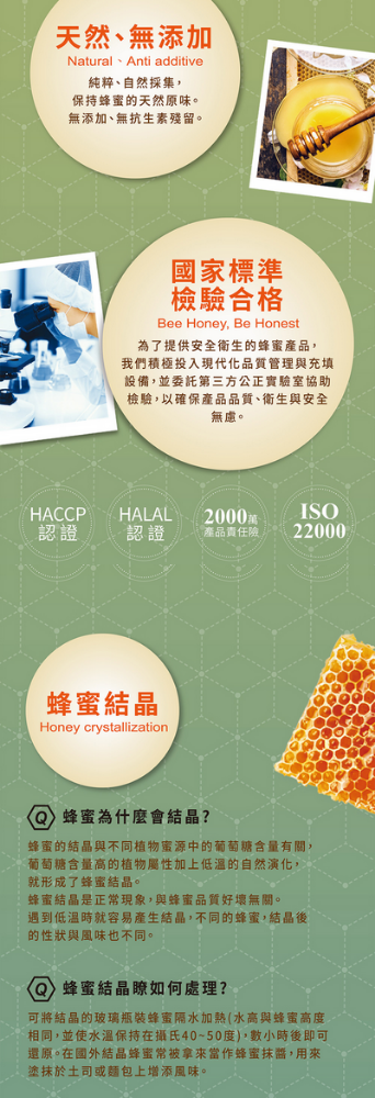 ◆蜂蜜。★材質:玻璃。★產地:泰國。★保存期限:2年(未開封)。★保存方法:請存放陰涼處所,避免日光直射。★食用方法:✽蜂蜜檸檬:加入少許蜂蜜對水沖泡,再添加些許檸檬汁,在炎炎夏日中是最美味也最解渴的健康飲品。✽蜂蜜抹醬:先將吐司、貝果放進烤箱溫熱,再抹上些許蜂蜜,就是最令人垂涎的蜂蜜吐司。✽蜂蜜鮮奶:可將蜂蜜添加於鮮奶、果汁中,甜甜的滋味可讓家中小朋友喝得更加有味,增進活力。★注意事項:1.蜂蜜本身具結晶特性,當溫度低於20C時,易產生結晶,此屬正常物理現象。2.可藉由浸在40C溫水,以攪拌方式恢復。3.蜂蜜中含有生菌,未滿三歲的幼兒不適合食用蜂蜜。4.蜂蜜含豐富營養物質,大部分物質在高溫下會被破壞,因此,應加溫水為宜(40~60C)。5.請在期限內使用完畢,確保享用最佳的蜂蜜品質。★商品已投保東京海上保險公司產品責任險貳千萬元整。★製造商:統香蜂蜜有限公司。〔禮盒尺寸:6.4x6.4x20.1cm〕 |