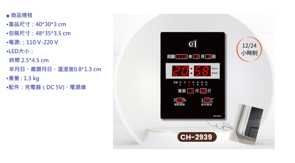 數位萬年曆/電子鐘/掛鐘/CH-2939/無音樂