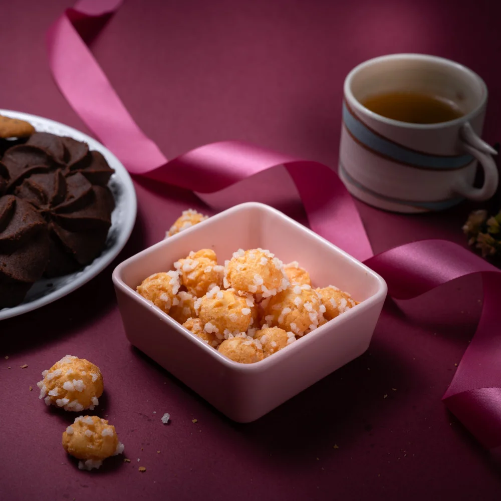 蝴蝶酥45g(3入)+椒鹽米果15.8g(2入)+紅玉焦糖米果15.1g(3入)+原味蛋捲152.5g(5入)+日月潭紅茶5包