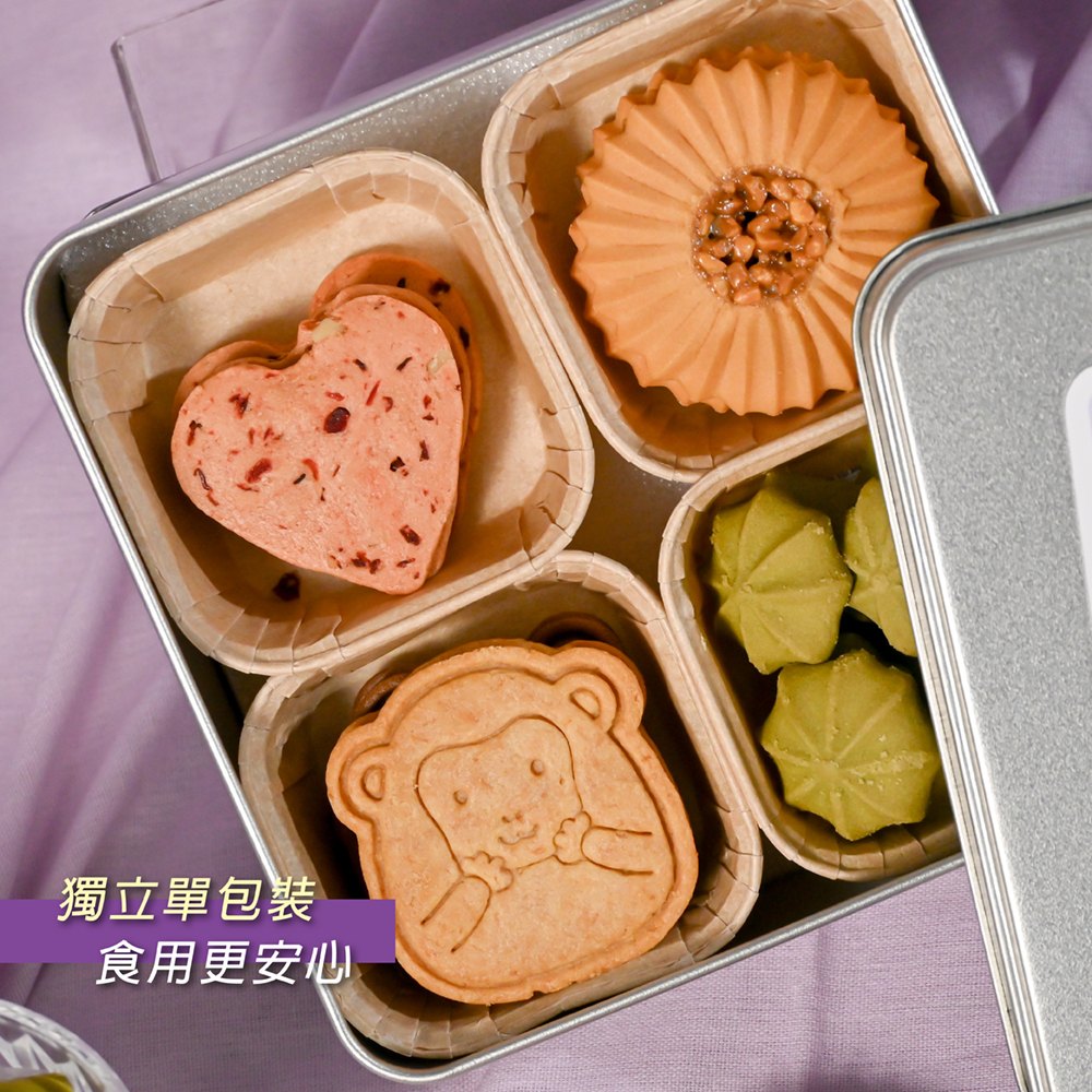淨重228g,洛神花茶餅x4片、碧螺春曲奇x8顆、紫薯黑熊x2片、初鹿獼猴x2片、蜂蜜蘿蜜雅x4片