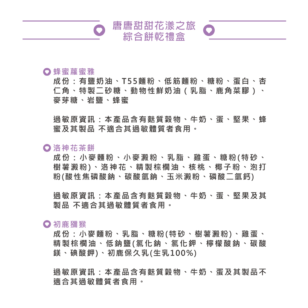 *洛神花茶餅:小麥麵粉、小麥澱粉、乳脂、雞蛋、糖粉(特砂、樹薯澱粉)、洛神花、精製棕櫚油、核桃、椰子粉、泡打粉(酸性焦磷酸鈉、碳酸氫鈉、玉米澱粉、磷酸二氫鈣)