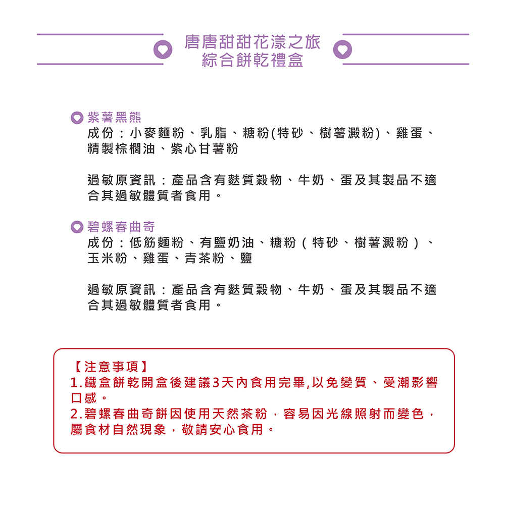 *紫薯黑熊:小麥麵粉、乳脂、糖粉(特砂、樹薯澱粉)、雞蛋、精製棕櫚油、紫心甘薯粉