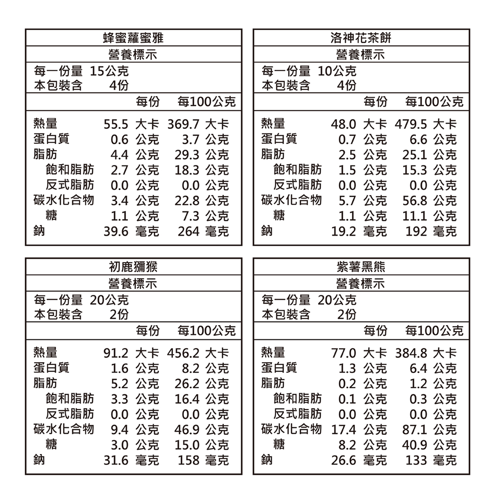 *初鹿獼猴:小麥麵粉、乳脂、糖粉(特砂、樹薯澱粉)、雞蛋、精製棕櫚油、低鈉鹽(氯化鈉、氯化鉀、檸檬酸鈉、碳酸鎂、碘酸鉀)、初鹿保久乳(生乳100%)