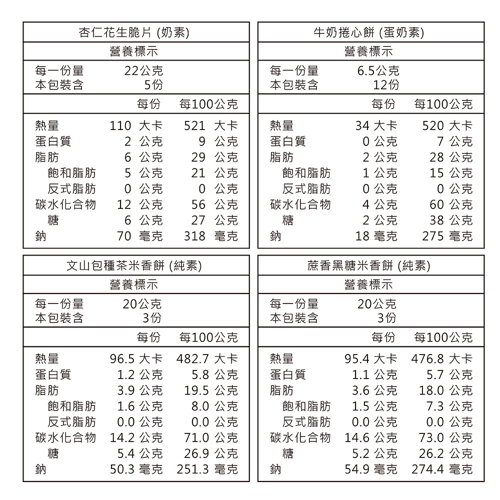 脆脆米香(黑糖&包種茶&黑米堅果)各x3片+花生脆片x5片+牛奶捲心酥x12支+核桃糙米燕麥飲x1盒