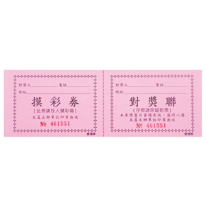 每張印有流水編號共6碼,每張的左聯為摸彩聯+右聯的對獎聯