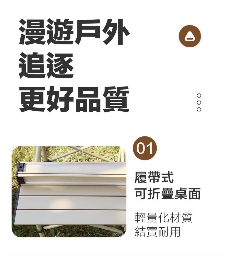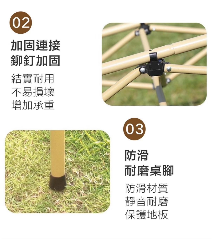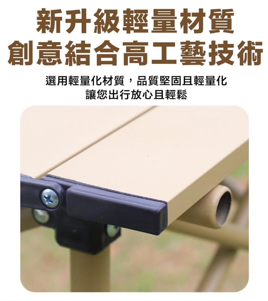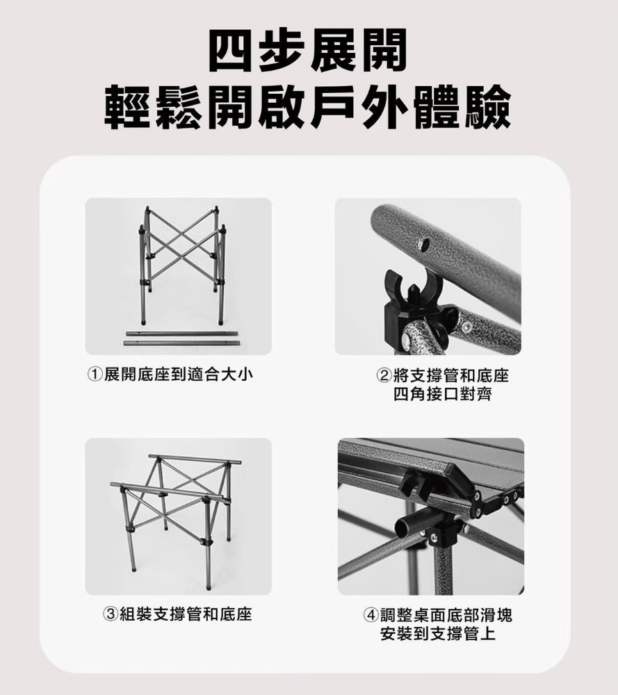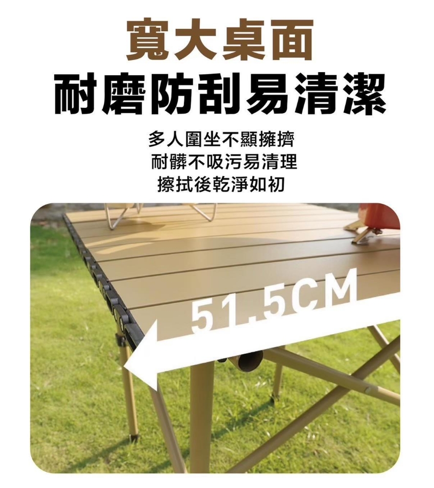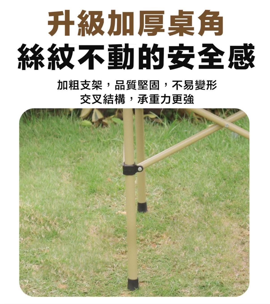 桌面寬大,捲折設計,輕鬆收納不佔空間。 穩固桌腿,牢固而用、承重力強。 組裝步驟簡單,快速拆裝。 附收納束口袋,外出攜帶方便。