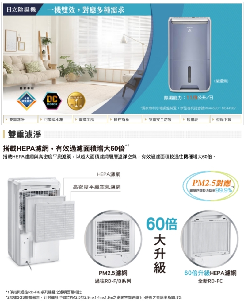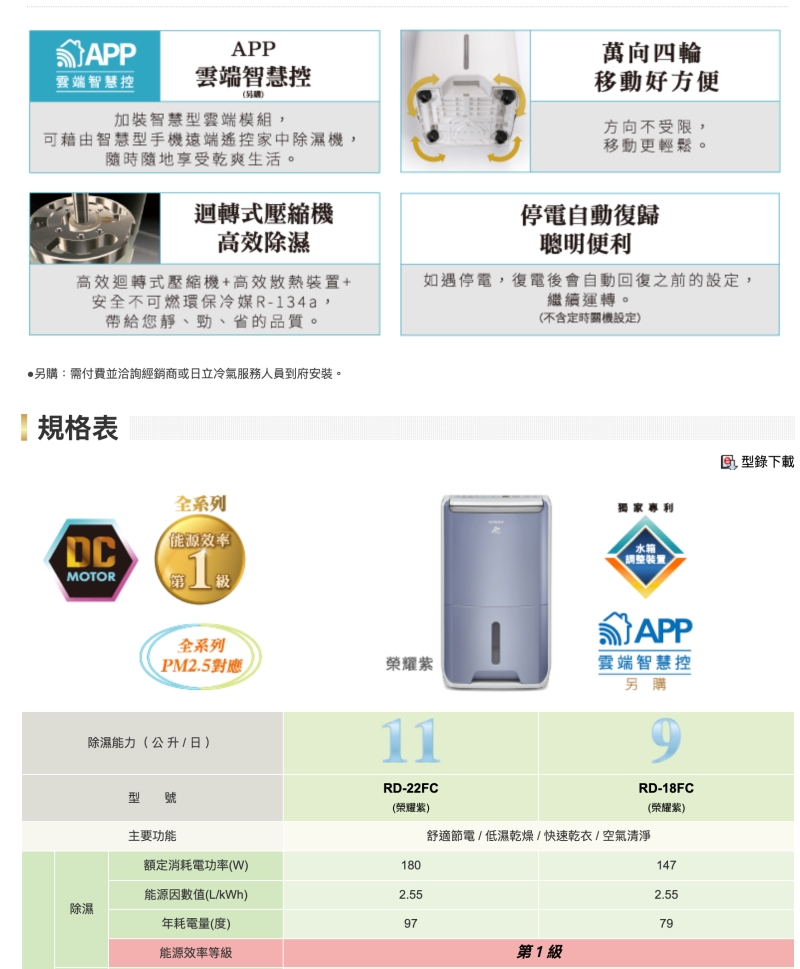 日立HITACHI DC舒適節電清淨除濕機/9公升/RD-18FC