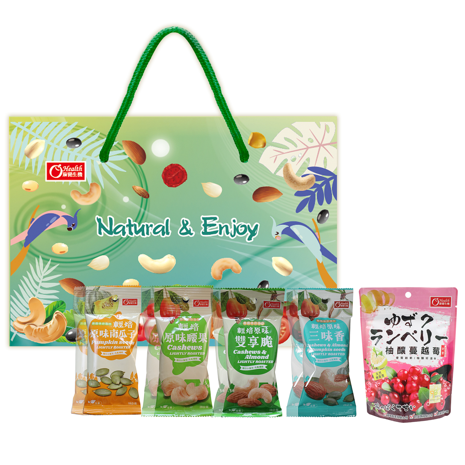 輕焙南瓜子18g*2入+輕焙原味腰果28g×2入+輕焙原味雙享脆28g*2入+輕焙原味三味香28*2入+柚釀蔓越莓100g*1入/盒