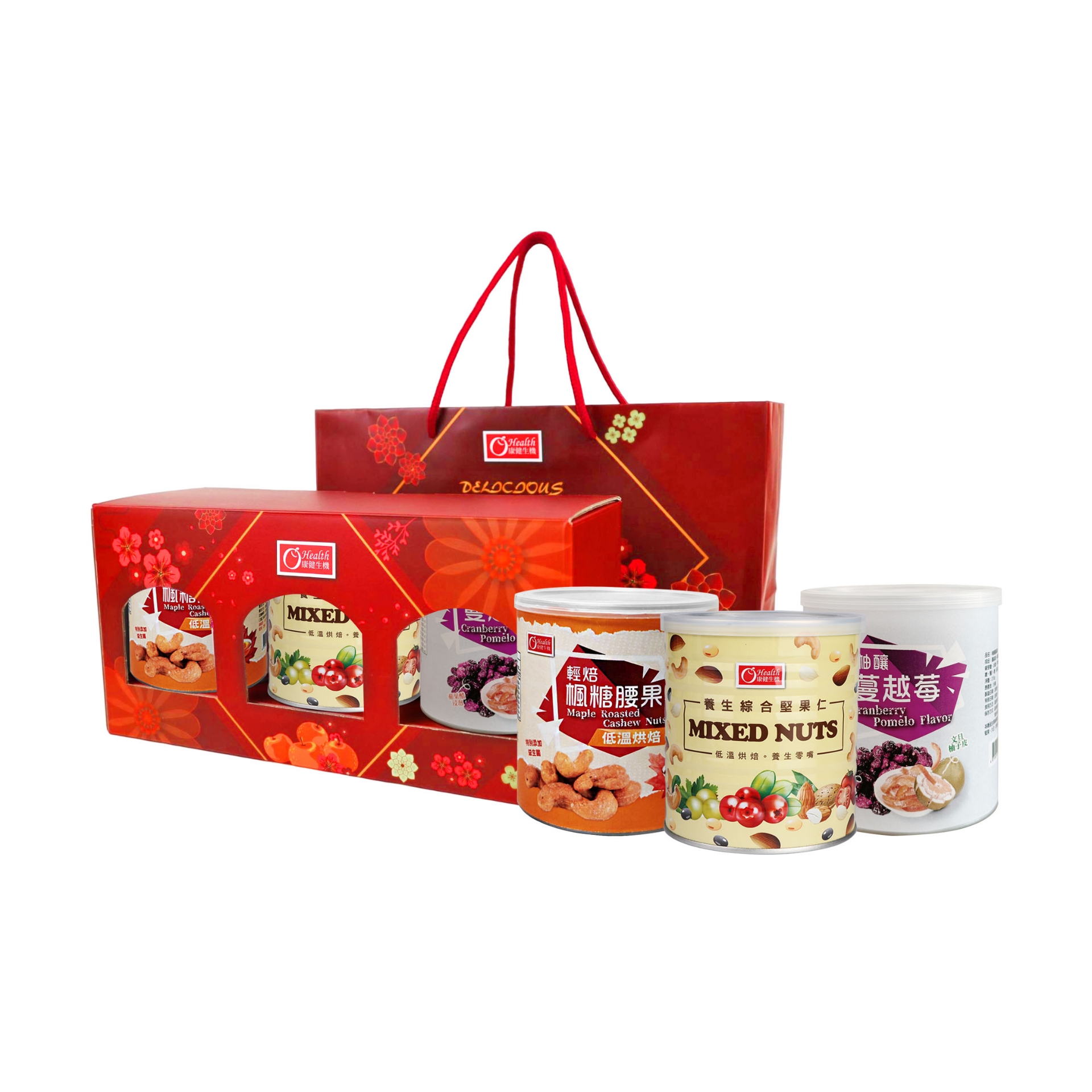 柚釀蔓越莓乾230g+輕烘焙楓糖腰果150g+養生綜合堅果仁300g/盒。