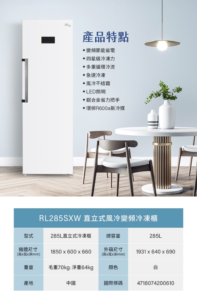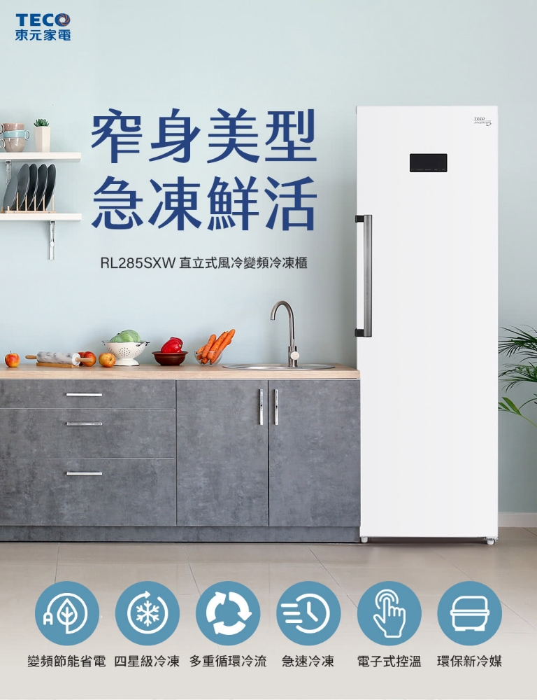 東元 285公升直立式變頻無霜冷凍櫃RL285SXW