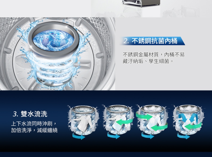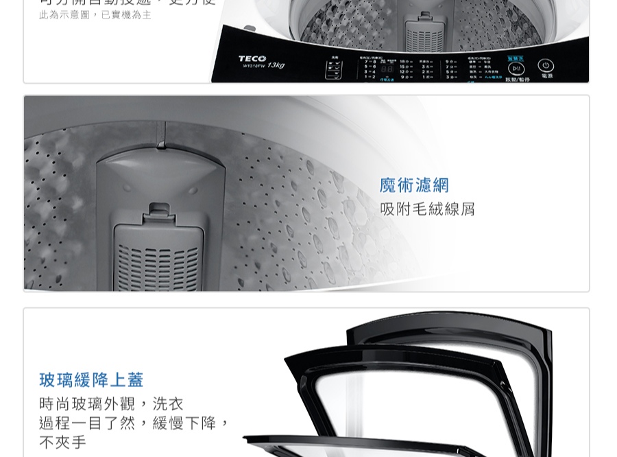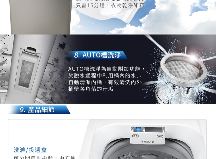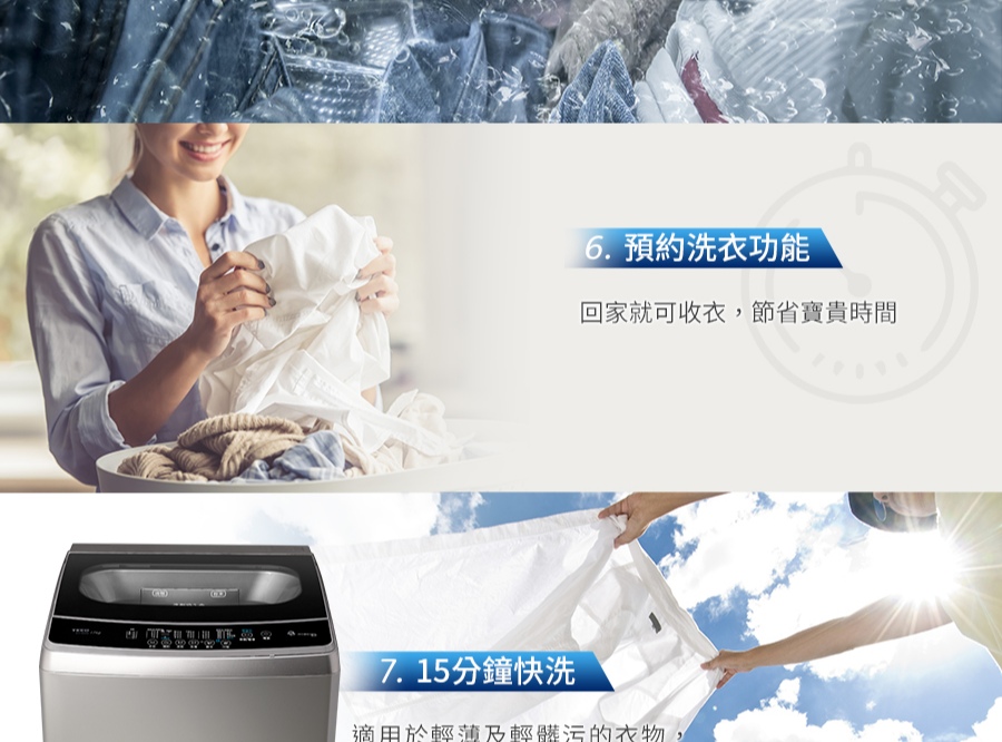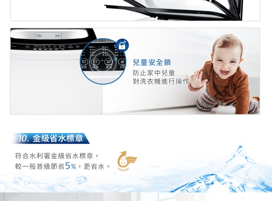 採用變頻直驅馬達 預約洗衣功能 金級省水標章 玻璃緩降上蓋、一鍵智慧洗 行程加速洗、預約功能 兒童安全鎖、金級省水 自動槽洗淨、魔術濾網 雙水流洗、快洗 七種洗衣程序、不鏽鋼內桶 *偏遠地區運費另計,不配送離島