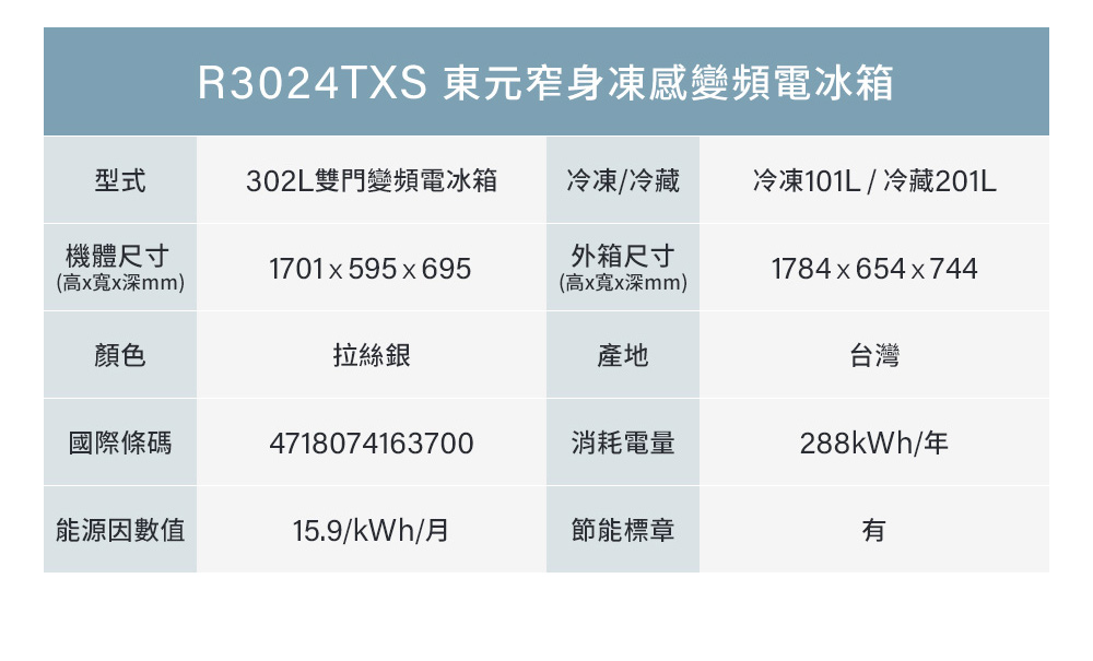 總 容 量:302L (冷藏201L、冷凍101L)