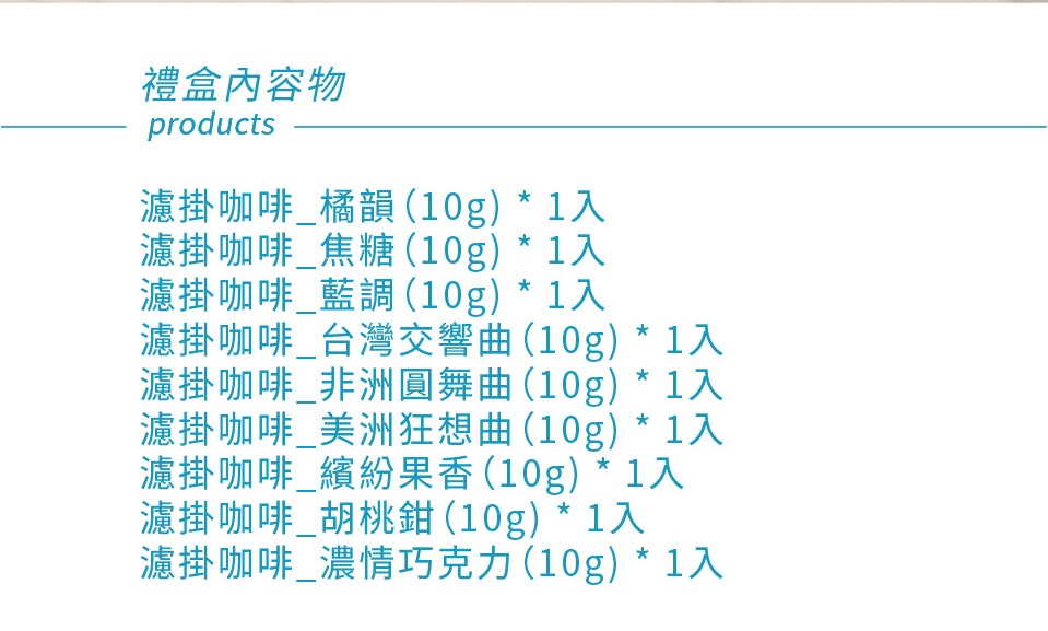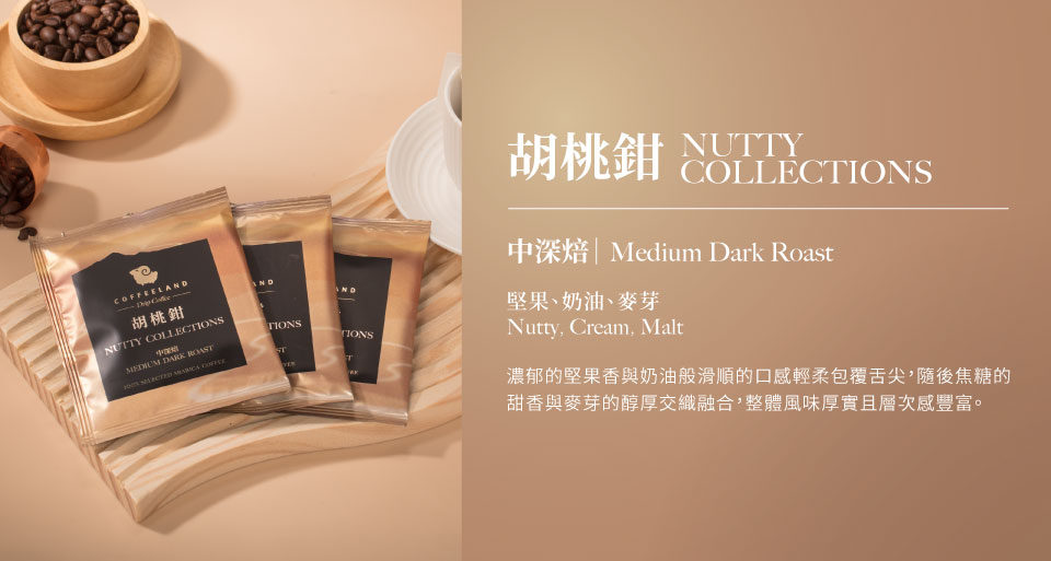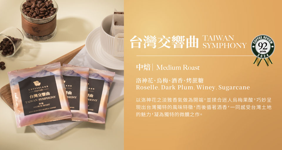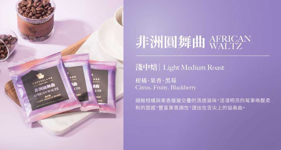 成分:100%阿拉比卡咖啡 製造地:台灣保存期限:18個月 存放方式:請避免放置於陽光直射或高溫潮濕處【9款風味】橘韻-柑橘、花香、莓果、熱帶水果焦糖-焦糖、可可、麥芽藍調-威士忌、莓果、巧克力台灣交響-洛神花、烏梅、酒香、烤蔗糖非洲圓舞曲-柑橘、果香、黑莓美洲狂想曲-桃子、蜂蜜、百香果繽紛果香-柑橘、李子乾、堅果、紅糖胡桃鉗-堅果、奶油、麥芽濃情巧克力-黑巧克力、焦糖、炭燒咖啡