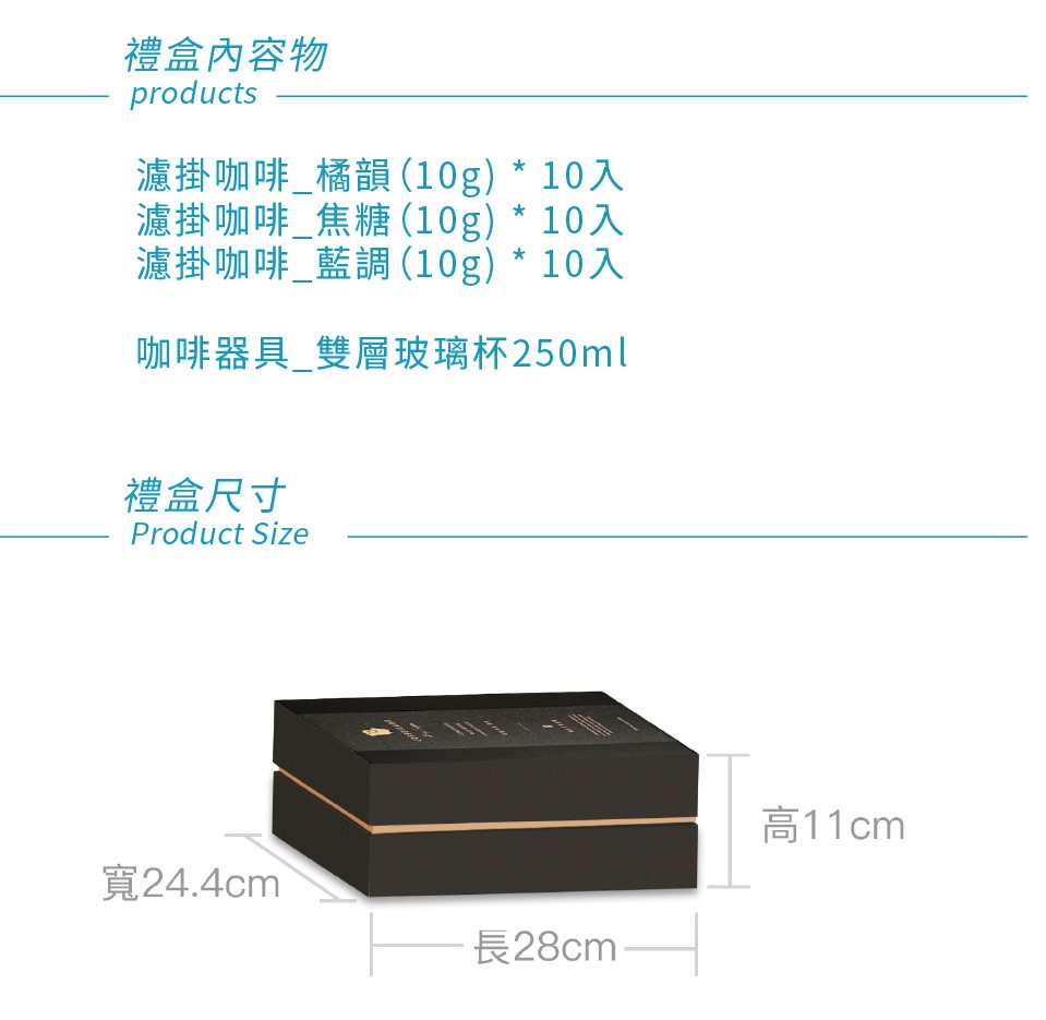 雙層玻璃杯250ml+橘韻(淺焙)+焦糖(中焙)+藍調(中深焙)各10入,共30入