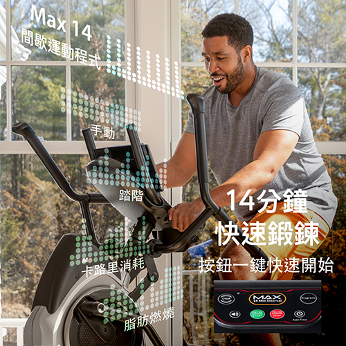顯示資訊:卡路里燃燒率、目標消耗率LED燈示指導、卡路里總計、間歇/運動時間、時間總計、心率、RPM、阻力等級