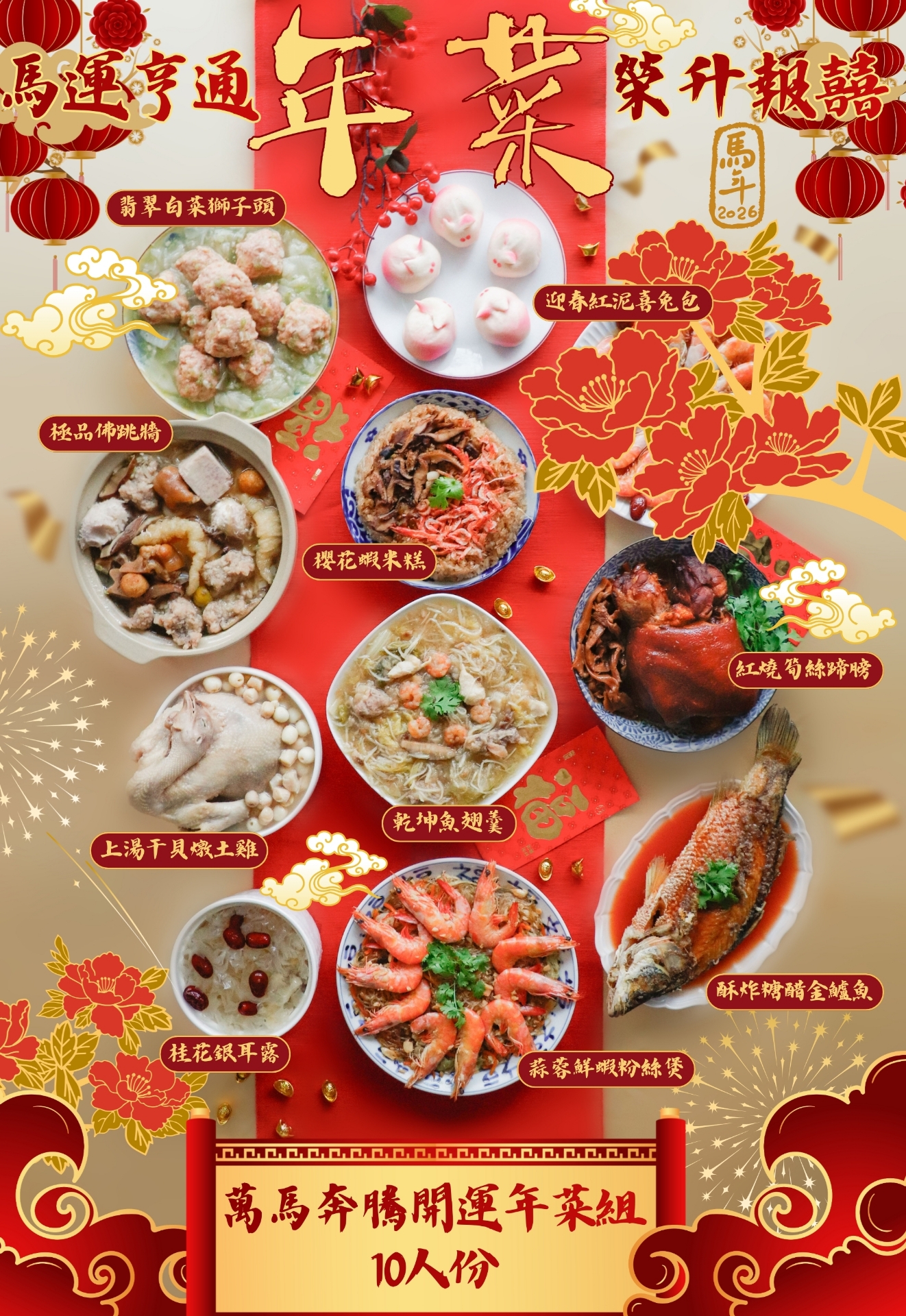 上湯干貝燉土雞2000g+紅燒筍絲蹄膀1250g(固形物1000g)+酥炸糖醋金爐魚600g(固形物400g)+蒜蓉鮮蝦粉絲煲600g+櫻花蝦米糕800g+乾坤魚翅羹1200g+極品佛跳牆2000g+翡翠白菜獅子頭1000g+桂花銀耳露1000g+迎春紅泥喜兔包350g