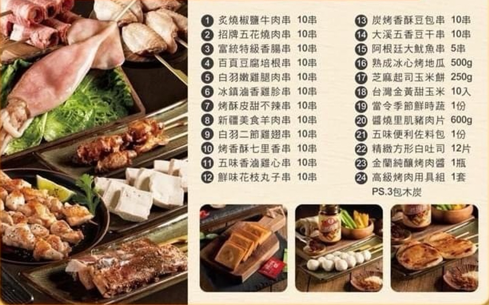 炙燒椒鹽牛肉10串+招牌五花燒肉10串+富統特級香腸10串+百頁豆腐培根10串+白羽嫩雞腿肉10串+冰鎮滷香雞胗10串+烤酥皮甜不辣10串+新疆美食羊肉10串+白羽二節雞翅10串+烤香酥七里香10串+五味香滷雞心10串+鮮味花枝丸子10串+炭烤香酥豆包10串+大溪五香豆干10串+阿根廷大魷魚串5串+熟成冰心烤地瓜500g+芝麻起司玉米餅250g+台灣金黃甜玉米10入+當令季節鮮時蔬1份+醬燒里肌豬肉片600g+五味便利佐料包1份+精緻方形白吐司12份+金蘭純釀烤肉醬1瓶+高級烤肉用具組1套+烤爐1組。 |