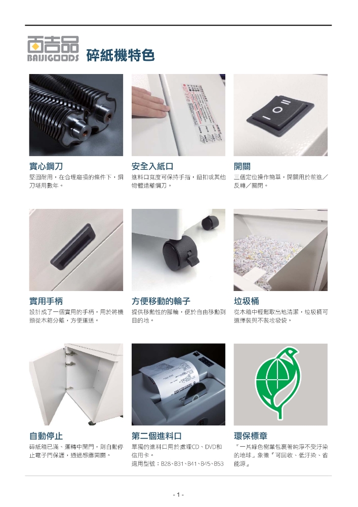 原產地:台灣 銷售方式:製造、批發、零售、出口 競爭特點 多樣設計:百吉品有限公司提供多樣化設計 設計變更不另通知、外觀細部僅供參考 碎斷率、切紙張數以實機為準 ± 10% |