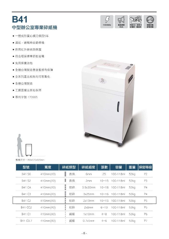 特色: ★台灣原裝製造 ★一體成形鋼刀(非片裝刀) ★金屬塑膠外殼、吸音木箱堅固耐用 ★前進、後退、停止、滿紙自動停止顯示 ★過載、過熱自動轉停止顯示 ★安全門開啟裝置自動停止 ★機器底部裝置4個活動輪(含以上) ★性能規格皆可依需求量身訂製