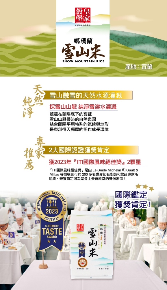 採純淨雪山溶水灌溉 媲美日本妙高山環境 一年一收的宜蘭純淨產地米 榮獲「日本米‧食味鑑定士」認證 2023年 ITI國際風味絕佳獎-2顆星