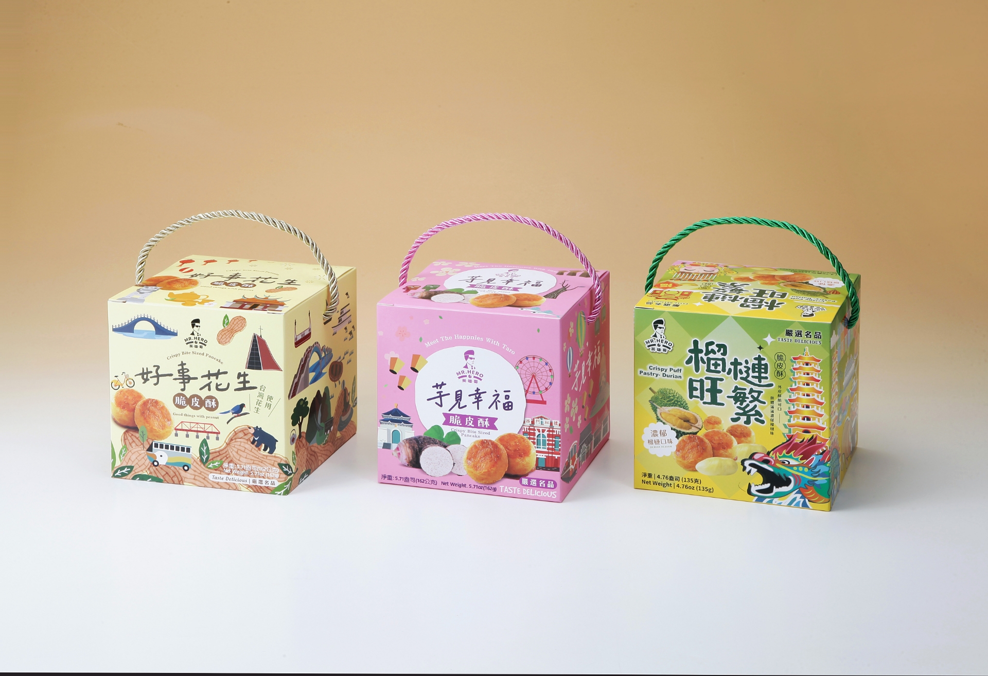 (A款)好事花生脆皮酥162g。 (B款)芋見幸福脆皮酥162g/盒。 (C款) 榴槤旺繁脆皮酥135g/盒。
