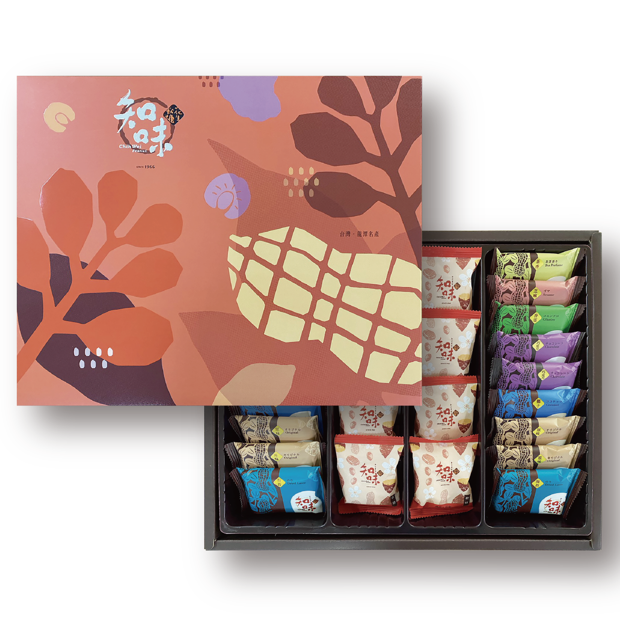 主要成份:花生、麥芽糖、葡萄糖、麵粉、鹽、大豆油、脫水香菜、黑白芝麻粒、椰子粉、乾燥烏龍茶、巧克力、海苔粉