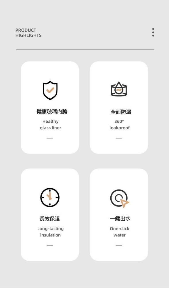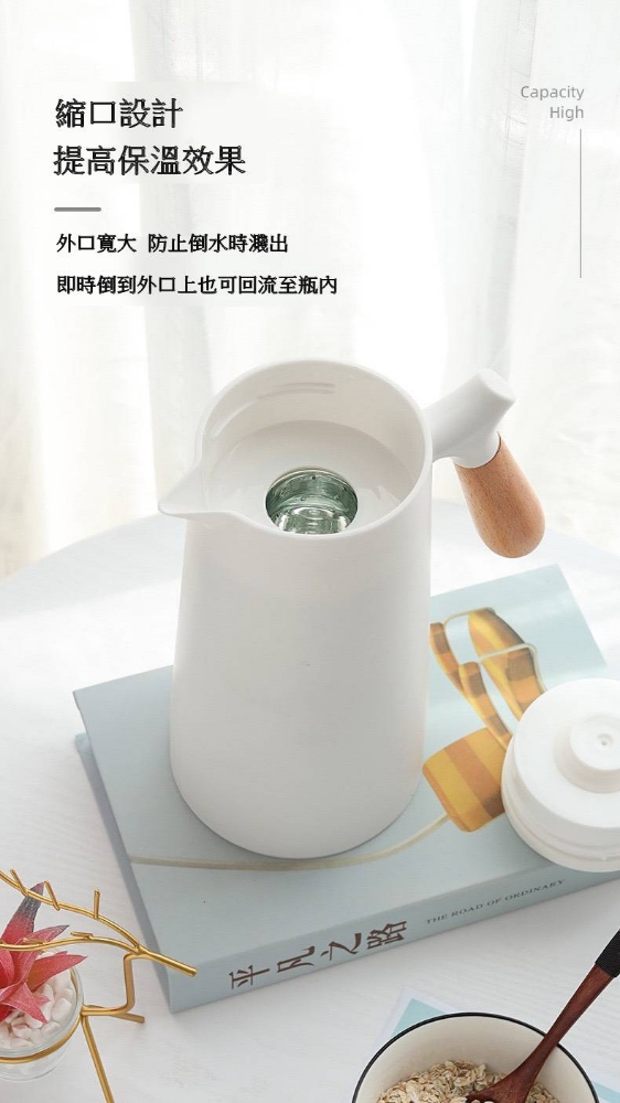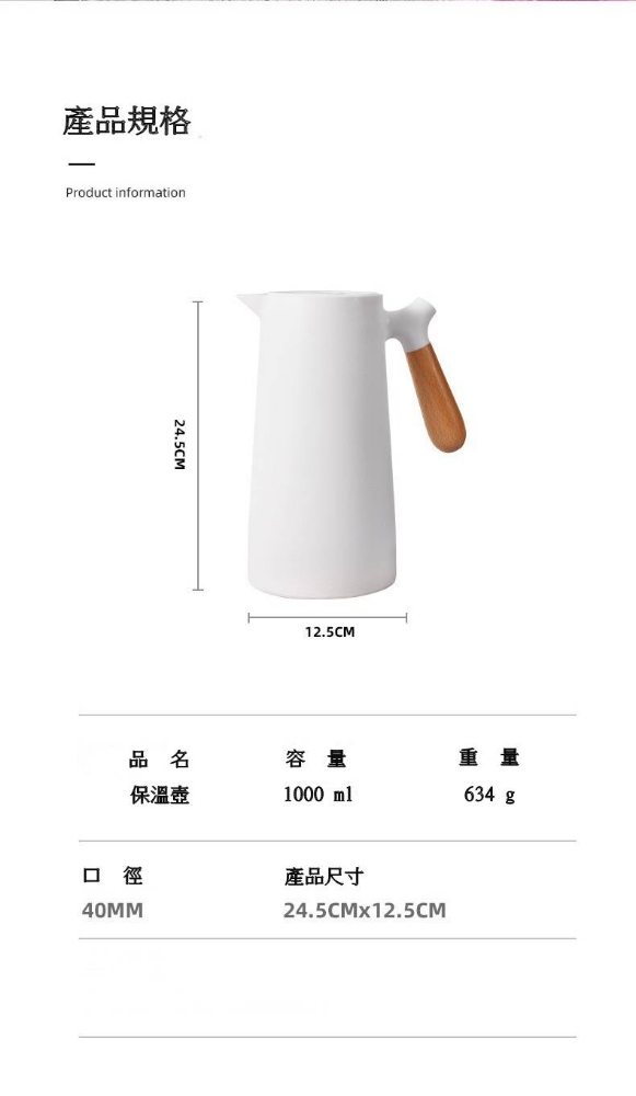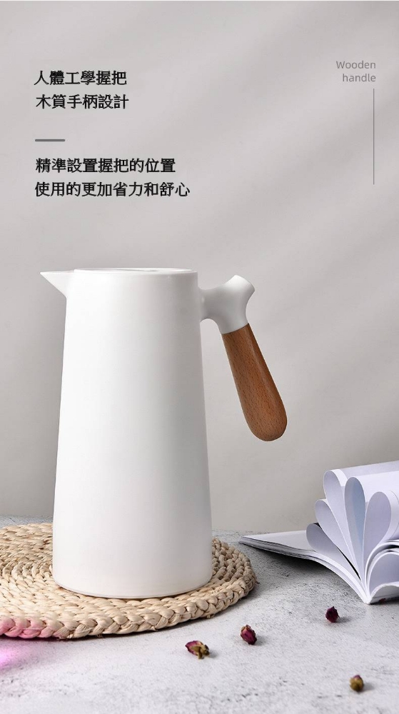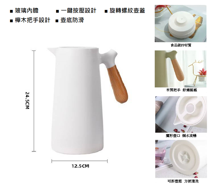 ■ 玻璃內膽,不挑飲品和重金屬困擾,可以安心使用■ 一鍵按壓設計,流暢出水,密封防漏■ 旋轉螺紋壺蓋,緊密貼合■ 櫸木把手設計,隔熱防燙,美觀典雅,握感舒適■ 壺底防滑,可拆卸,便於清洗主商品:保溫壺x1顏色:隨機出貨材質:外層PP、內膽玻璃鍍層、矽膠、櫸木把手產品尺寸:直徑13.6x高24.6cm容量:1000ml產地:中國