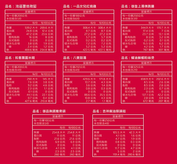 御品富貴大前蹄850g(固形物750g)、一品女兒紅燒雞600g(固形物400g)、御皇上湯佛跳牆750g(固形物390g)、如意團圓米糕800g、八寶甜湯1000g(固形物480g)、蠔油鮮蝦粉絲煲650g(固形物350g)、御品無錫嫩骨頭500g(固形物320g)、吉祥麻油猴頭菇1000g(固形物330g)