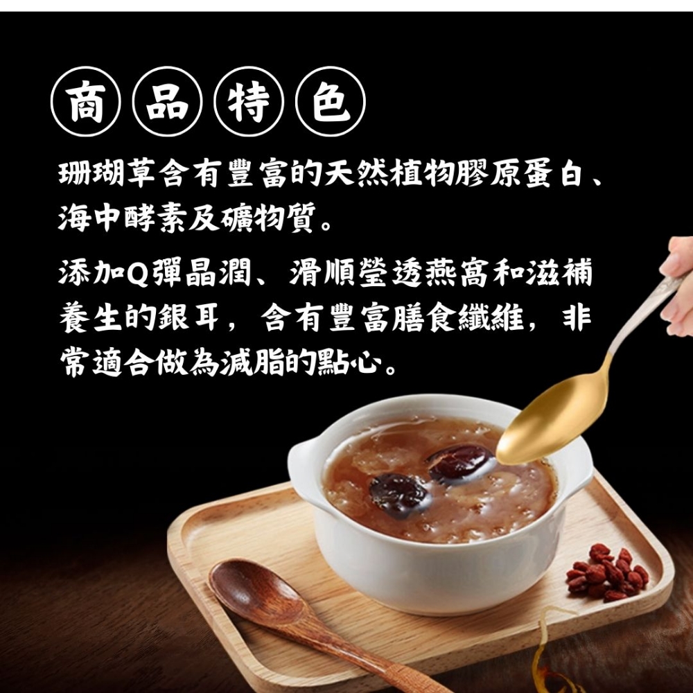 內容物:(純素)水、白木耳、紅冰糖、珊瑚草、紅棗、桂圓、燕窩