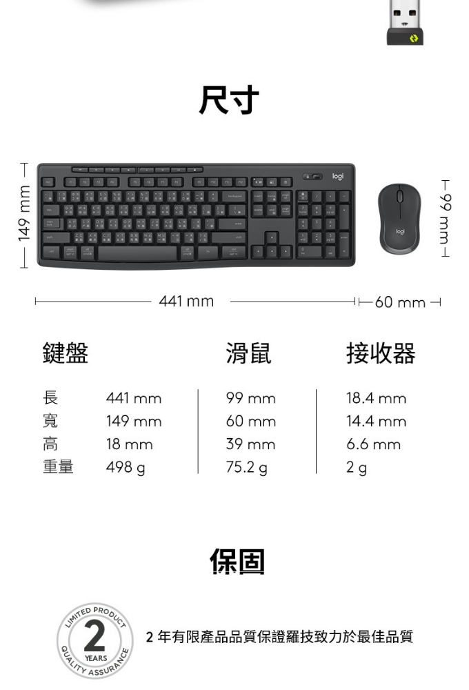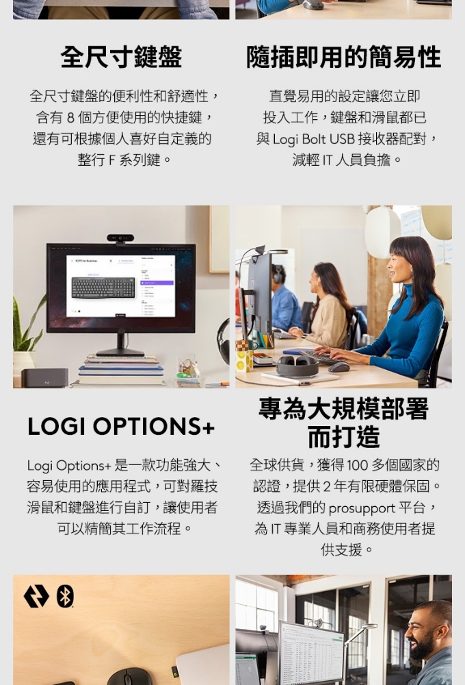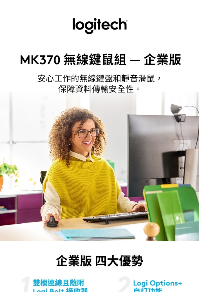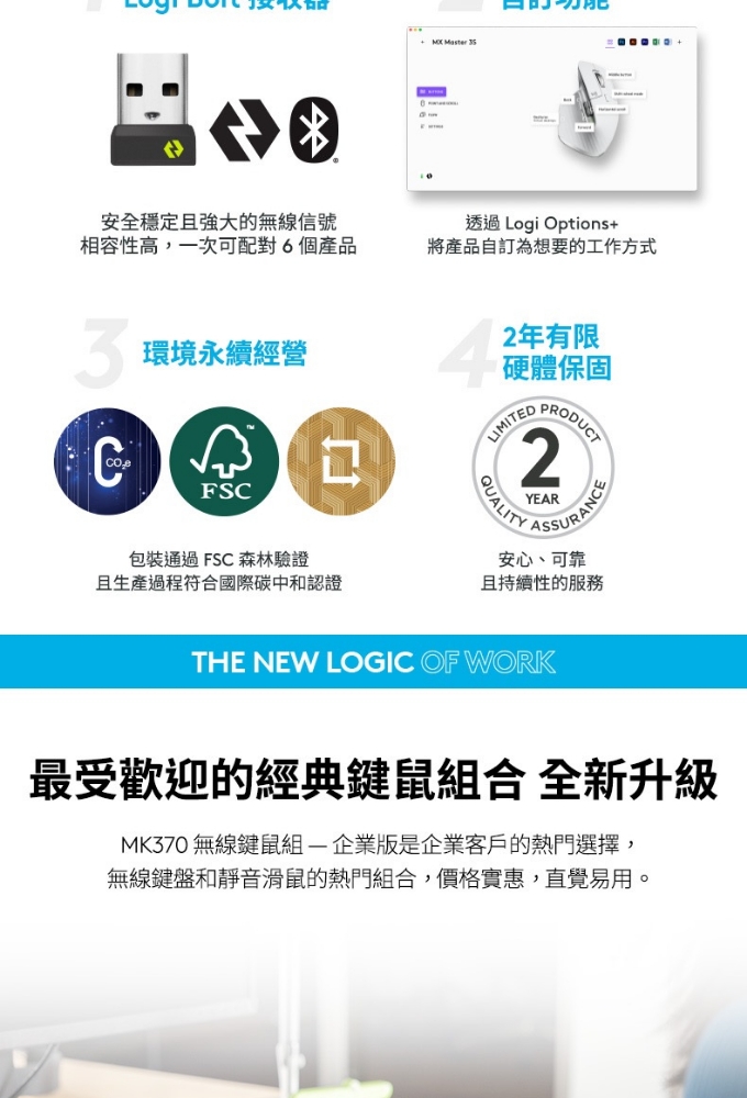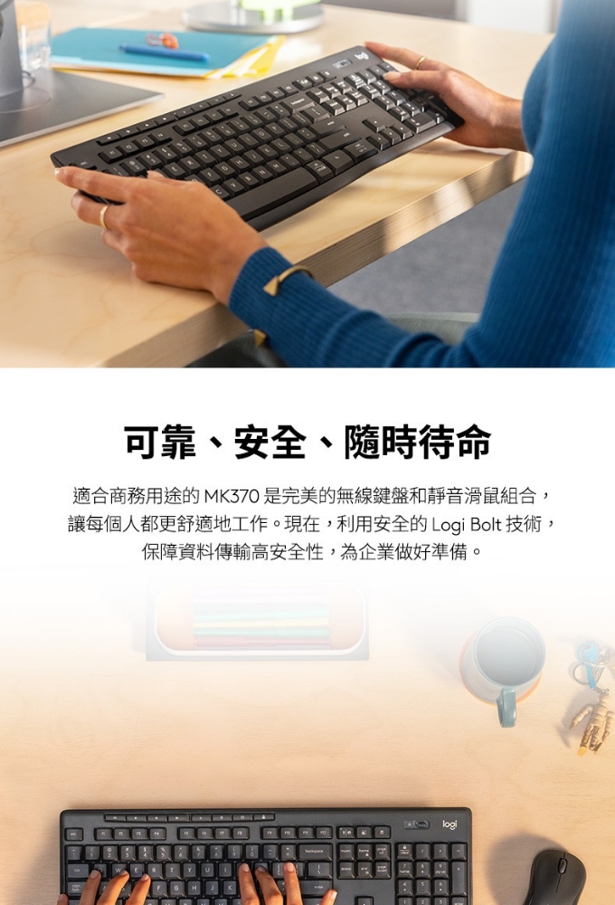 🔷單一Logi Bolt USB 接收器,同時連結鍵盤及滑鼠 適合商務用途的 MK370 是羅技最暢銷的企業升級鍵鼠組合 這款無線生產力雙件組合開箱即用,立即可用 可靠、安全、隨時待命、持久耐用的品質 靜音觸控技術 包裝紙材:FSC 認證 獲得碳中和認證 保固資訊:2 年有限硬體保固 羅技台灣地區販售之鍵盤鍵帽皆為中文標示,有注音倉頡之版本