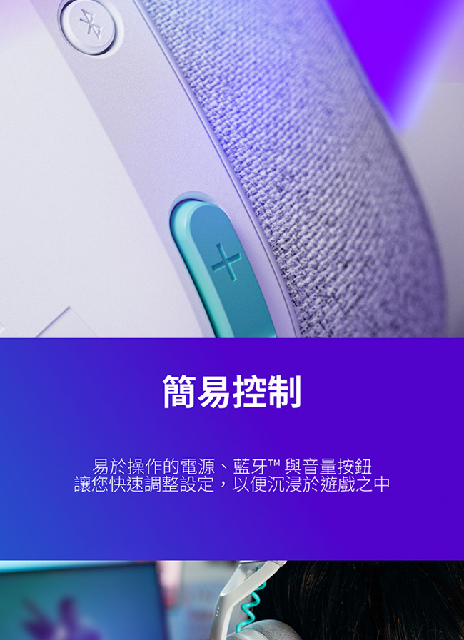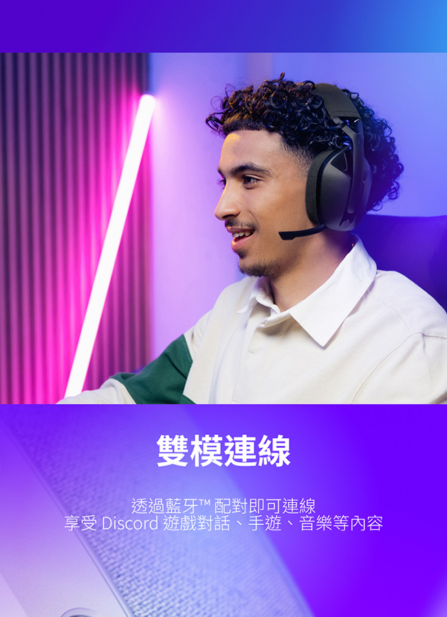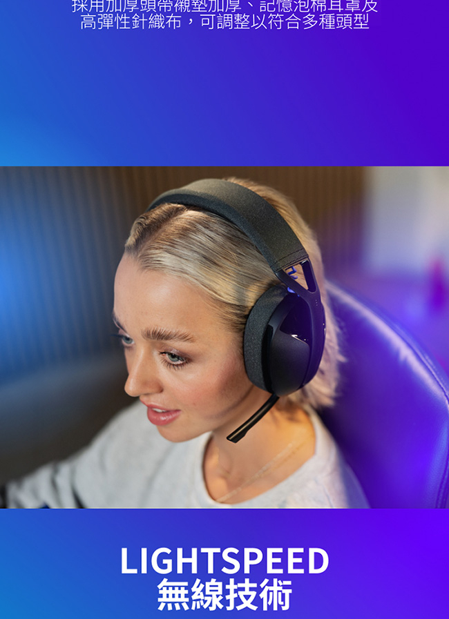 重量僅210公克,輕量舒適兼具 採用高彈性針織布及記憶泡棉 無線/藍牙雙模連線 2.4GHz LIGHTSPEED無線技術 高效能音訊單體,強大沉浸感 ▶其他顏色:白