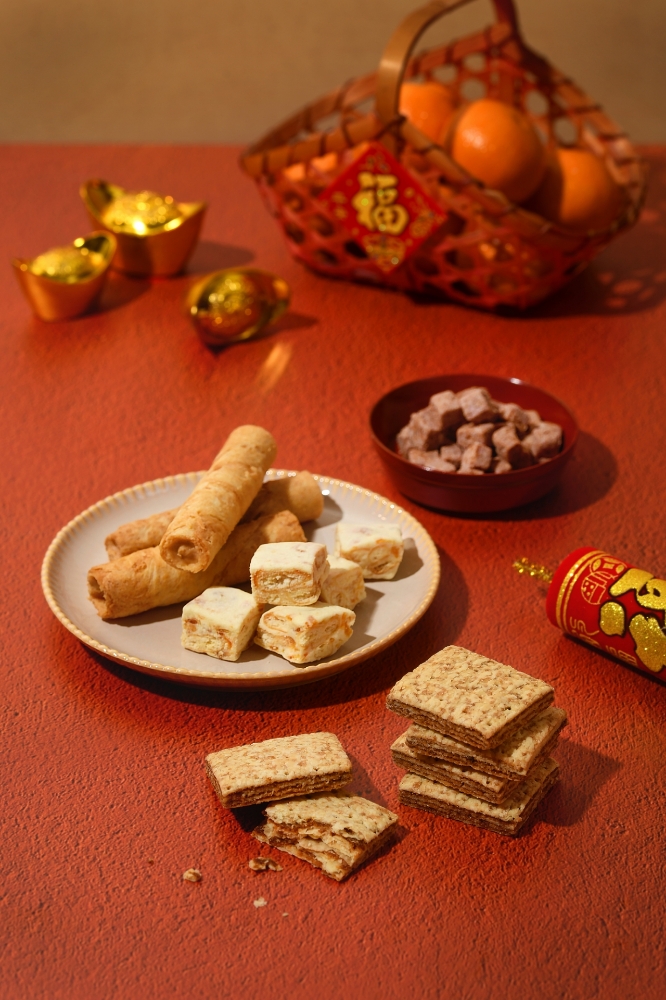 金桔雪花酥 成分 : 棉花糖[玉米糖漿、糖、水、食用明膠(來源:豬)、葡萄糖、酸處理澱粉、香草香料、焦磷酸鈉]、岩鹽餅乾[麵粉、棕櫚油、砂糖、大豆油、鹽、無水奶油、碳酸氫銨、碳酸氫鈉、牛奶香料粉(葡萄糖、香料、丙二醇)、香草粉(無水葡萄糖、乙基香莢蘭醛、香莢蘭醛、乙基麥芽醇)、大豆卵磷脂(非基因改造)、辣椒紅、β-胡蘿蔔素]、金桔果乾[金桔、砂糖、麥芽糖(樹薯澱粉、水、液化酵素、糖化酵素)]、奶油、奶粉、優酪粉[砂糖、脫脂奶粉、麥芽糊精、全脂奶粉、葡萄糖、檸檬酸、酵母精粉、香料、脂肪酸甘油酯(植物性)]、香料 / 保存期限:8個月