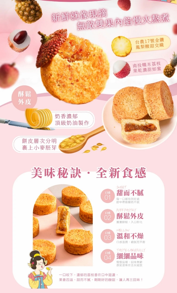 不像傳統鳳梨酥厚重甜膩,貴妃鳳荔酥更輕盈、果香更奔放、口感更細膩。