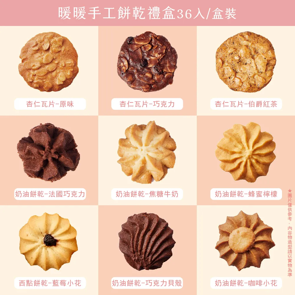 規格:10g±10%/入,共36入/盒。內容物:杏仁瓦片(原味x4、巧克力口味x4、伯爵口味x4)+奶油餅乾(法國巧克力x4、焦糖牛奶x4、蜂蜜檸檬x4)+西點餅乾(巧克力貝殼x4、咖啡小花x4、藍莓小花x4)。〔禮盒尺寸:31x6.5x21cm〕◆杏仁瓦片(原味)成份:杏仁薄片、麵粉、奶油、糖、蛋、鹽