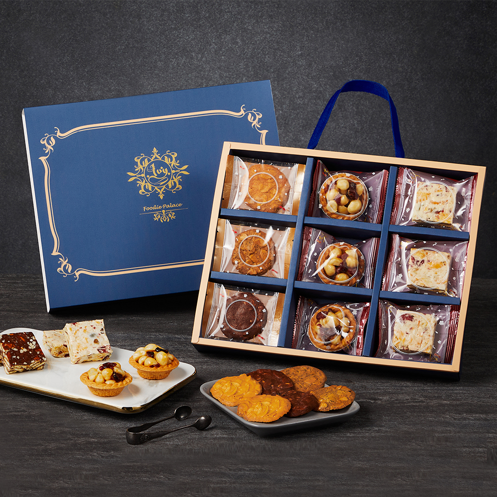 夏威夷豆塔(蜂蜜蔓越莓*3)+雪花餅(蔓越莓*3、巧克力*3)+杏仁瓦片(原味*4、伯爵紅茶*4、巧克力*4)/盒