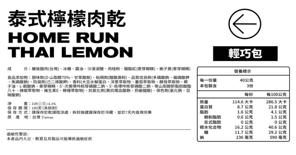 【中華直棒泰式檸檬肉乾】 成分:豬後腿肉(台灣)、冰糖、醬油、沙漠湖鹽、肉桂粉、胭脂紅(麥芽糊精)、梔子黃(麥芽糊精) 食品添加物:甜味劑(D-山梨醇70%、甘草酸銨)、粘稠劑(醋酸澱粉)、品質改良劑(多磷酸鈉、偏磷酸鉀、焦磷酸鈉)、防腐劑(己二烯酸鉀)、香料(大豆水解蛋白、洋蔥萃取物、蕃茄萃取物、酵母萃取物、椰子油、L-麩酸鈉、麥芽糊精、5'-次黃嘌呤核苷磷酸二鈉、5'-鳥嘌呤核苷磷酸二鈉、聚山梨醇酐脂肪酸酯八十、辣椒萃取物、維生素E、檸檬萃取物)、抗氧化劑(異抗壞血酸鈉、菸鹼醯胺)、保色劑(氯化鈉、亞硝酸鈉) |