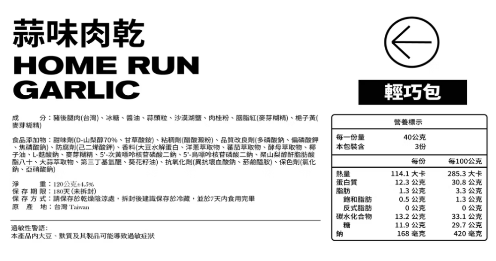 【中華直棒蒜味肉乾】 成分:豬後腿肉(台灣)、冰糖、醬油、蒜頭粒、沙漠湖鹽、肉桂粉、胭脂紅(麥芽糊精)、梔子黃(麥芽糊精) 食品添加物:甜味劑(D-山梨醇70%、甘草酸銨)、粘稠劑(醋酸澱粉)、品質改良劑(多磷酸鈉、偏磷酸鉀、焦磷酸鈉)、防腐劑(己二烯酸鉀)、香料(大豆水解蛋白、洋蔥萃取物、蕃茄萃取物、酵母萃取物、椰子油、L-麩酸鈉、麥芽糊精、5'-次黃嘌呤核苷磷酸二鈉、5'-鳥嘌呤核苷磷酸二鈉、聚山梨醇酐脂肪酸酯八十、大蒜萃取物、第三丁基氫醌、葵花籽油)、抗氧化劑(異抗壞血酸鈉、菸鹼醯胺)、保色劑(氯化鈉、亞硝酸鈉)