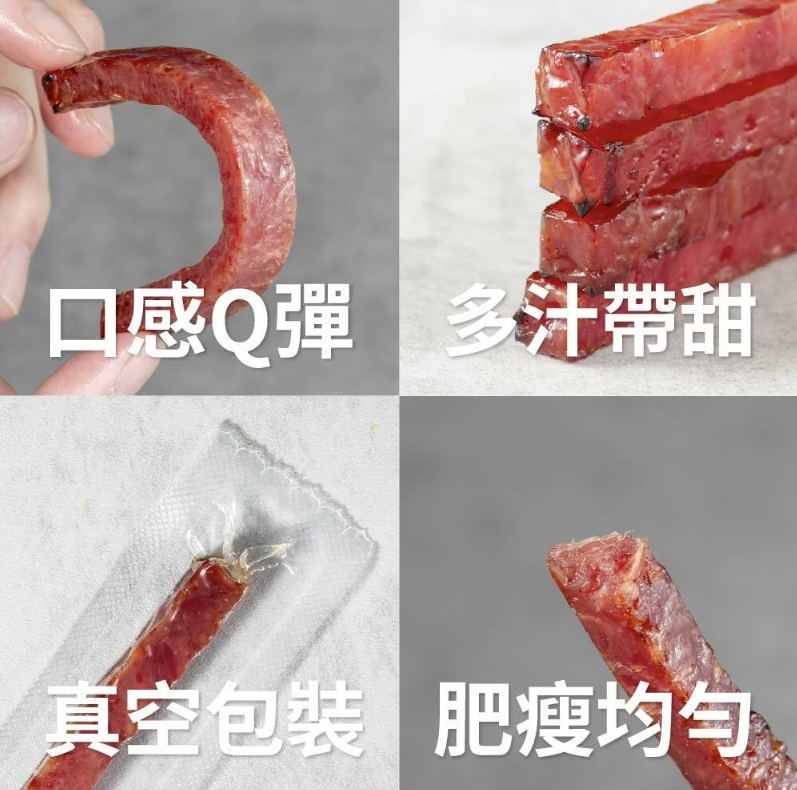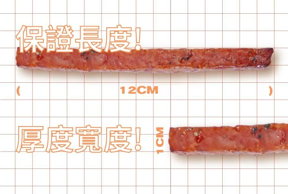 【中華直棒蜜汁肉乾】 成分:豬後腿肉(台灣)、冰糖、醬油、沙漠湖鹽、薑粉、肉桂粉、胭脂紅(麥芽糊精)、梔子黃(麥芽糊精) 食品添加物:甜味劑(D-山梨醇70%、甘草酸銨)、粘稠劑(醋酸澱粉)、品質改良劑(多磷酸鈉、偏磷酸鉀、焦磷酸鈉)、防腐劑(己二烯酸鉀)、香料(大豆水解蛋白、洋蔥萃取物、蕃茄萃取物、酵母萃取物、椰子油、L-麩酸鈉、麥芽糊精、5'-次黃嘌呤核苷磷酸二鈉、5'-鳥嘌呤核苷磷酸二鈉)、抗氧化劑(異抗壞血酸鈉、菸鹼醯胺)、保色劑(氯化鈉、亞硝酸鈉)
