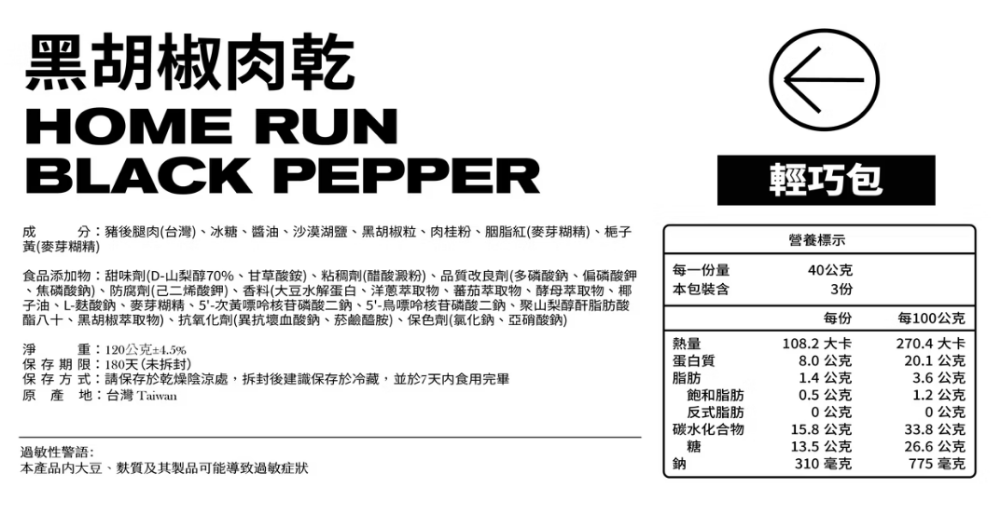 【中華直棒黑胡椒肉乾】 成分:豬後腿肉(台灣)、冰糖、醬油、沙漠湖鹽、黑胡椒粒、肉桂粉、胭脂紅(麥芽糊精)、梔子黃(麥芽糊精) 食品添加物:甜味劑(D-山梨醇70%、甘草酸銨)、粘稠劑(醋酸澱粉)、品質改良劑(多磷酸鈉、偏磷酸鉀、焦磷酸鈉)、防腐劑(己二烯酸鉀)、香料(大豆水解蛋白、洋蔥萃取物、蕃茄萃取物、酵母萃取物、椰子油、L-麩酸鈉、麥芽糊精、5'-次黃嘌呤核苷磷酸二鈉、5'-鳥嘌呤核苷磷酸二鈉、聚山梨醇酐脂肪酸酯八十、黑胡椒萃取物)、抗氧化劑(異抗壞血酸鈉、菸鹼醯胺)、保色劑(氯化鈉、亞硝酸鈉)