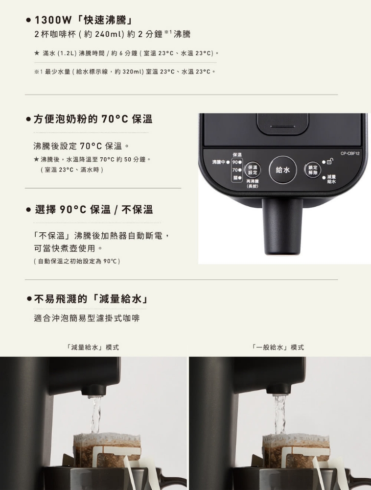 (1) 新型式1.2L容量,使用熱水的早晚時間,沖泡牛奶也有充足的容量。