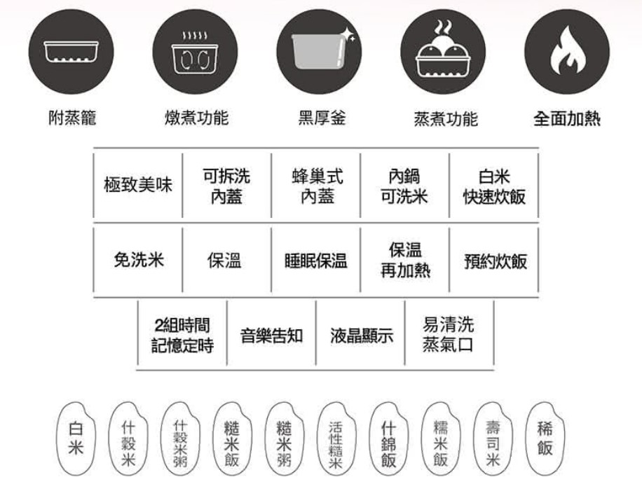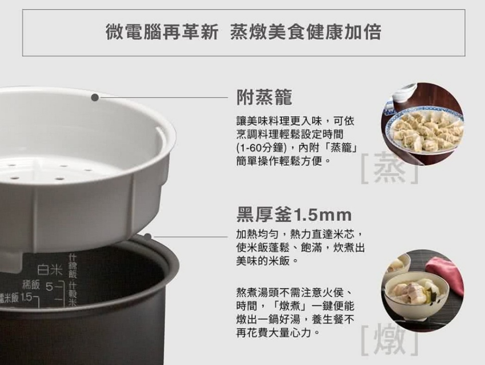 🔶附蒸籠,搭載蒸煮功能 🔶可選擇極致美味(拜白) 🔶可拆洗內蓋,清洗更簡便