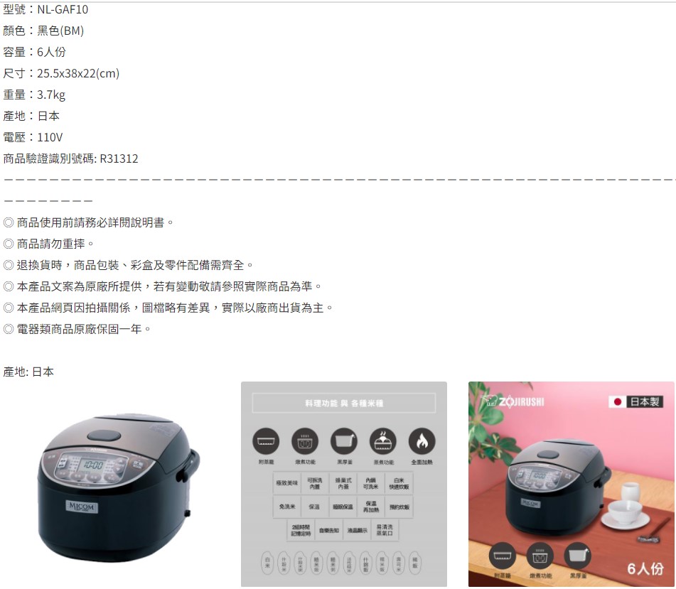 【象印】6人份*黑厚釜微電腦電子鍋(NL-GAF10)-黑色