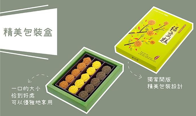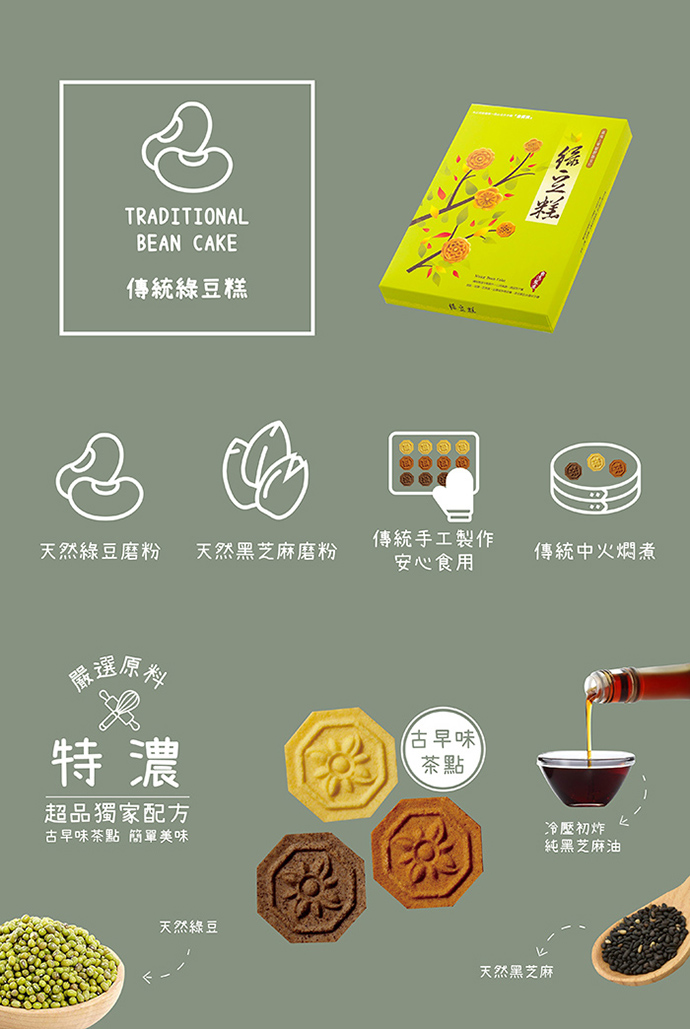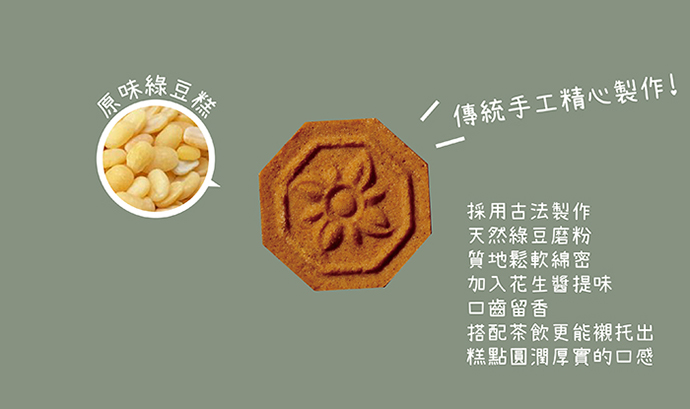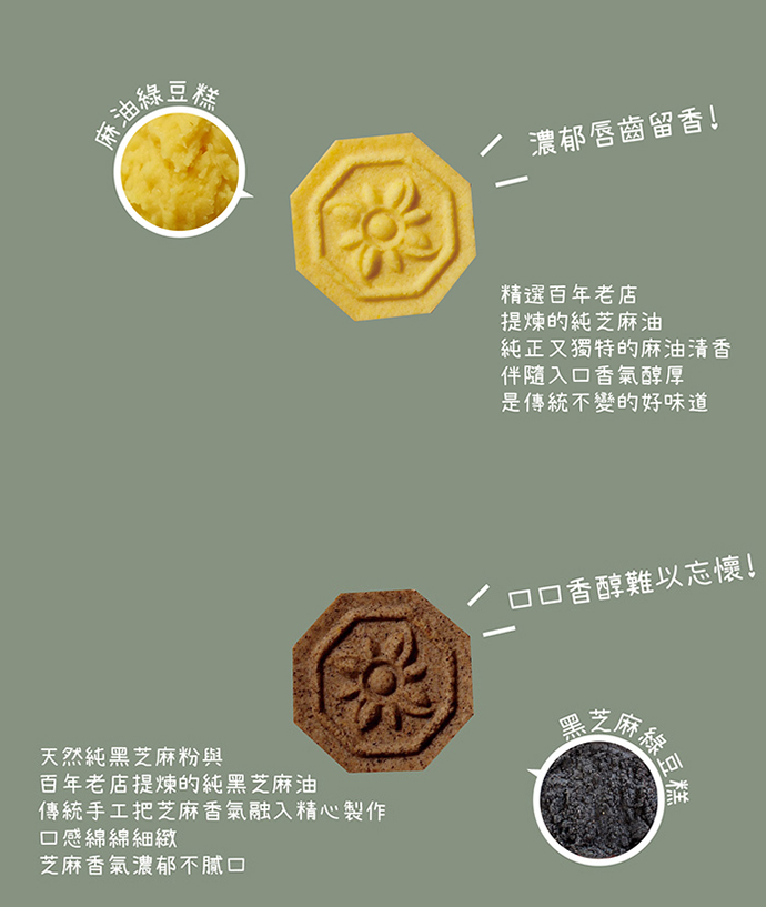 成份:熟綠豆粉、熟小麥粉、糯米粉、糖粉、軟化糖、雪白奶油、鹽。