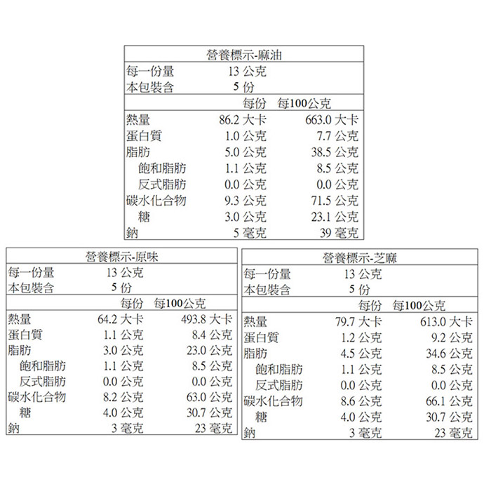 規格:原味13gx5入、香麻油3gx5入、黑芝麻3gx5入。