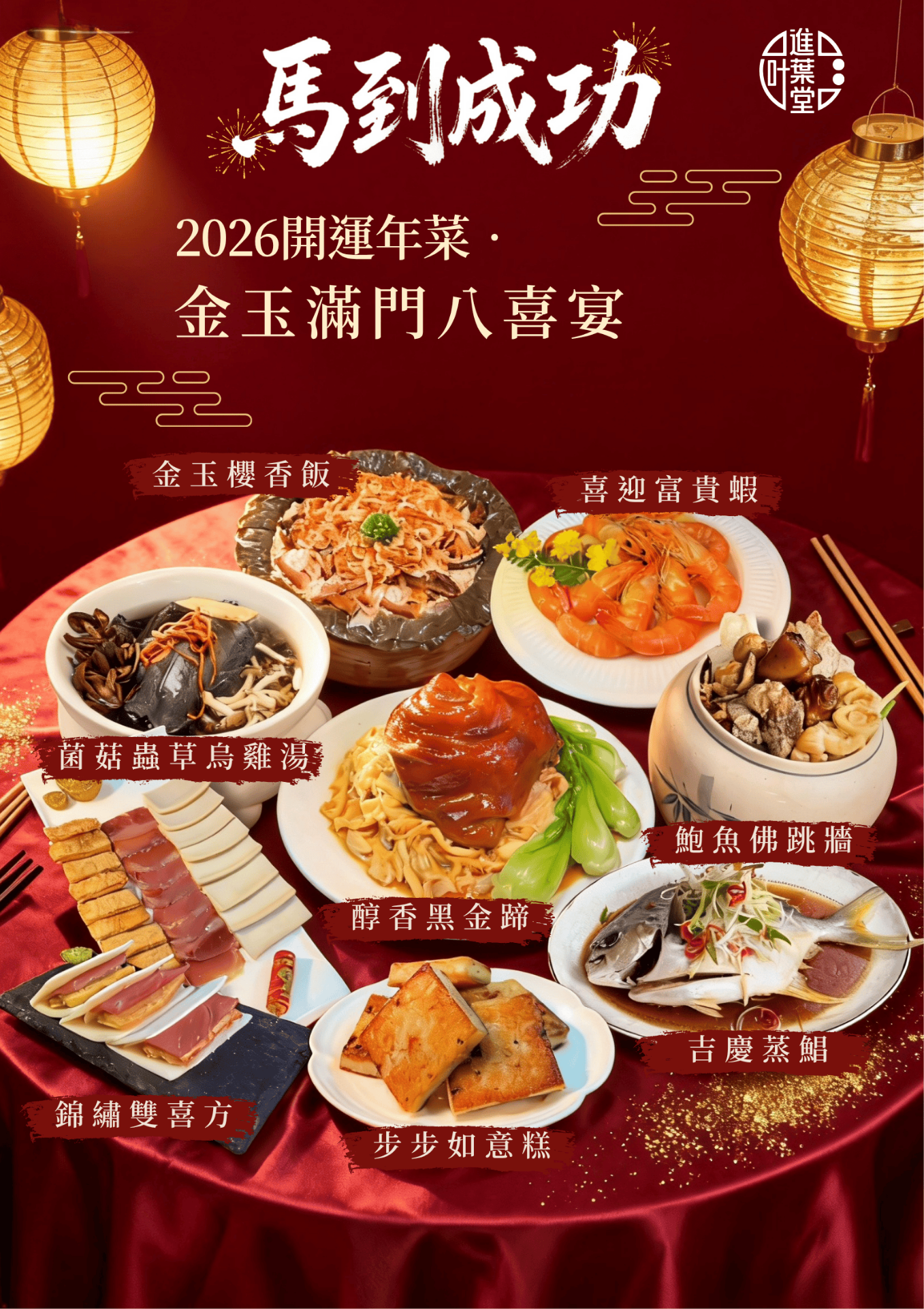 菌菇蟲草烏雞湯2100g+醇香黑金蹄(固體1000g+湯汁250g)+吉慶蒸鯧(固體600g+湯汁300g)+喜迎富貴蝦600g+錦繡雙喜方450g+金玉櫻蝦飯600g+鮑魚佛跳牆(固體1200g+湯汁1100g)+步步如意糕8片
